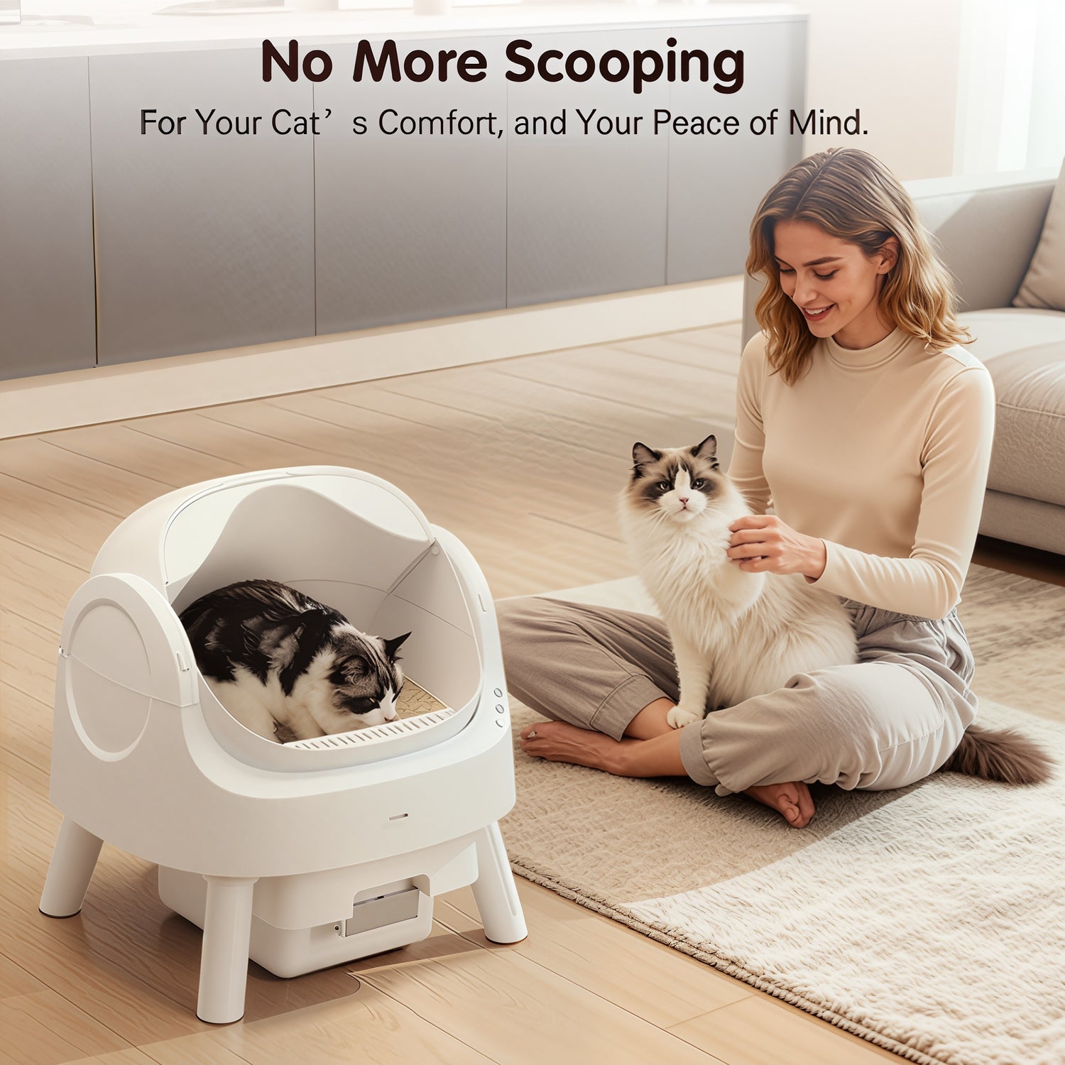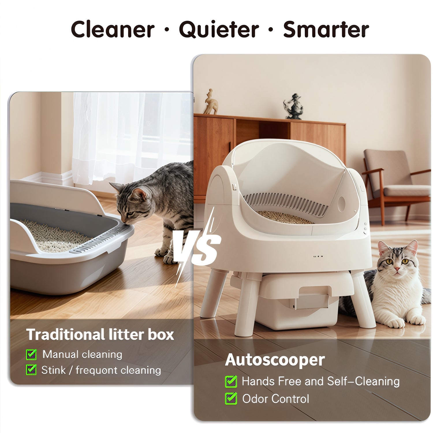 Ditch the mess! Our autoscooper is cleaner, quieter, and smarter than traditional boxes. Enjoy hands-free, self-cleaning convenience while keeping odors at bay. More time for snuggles and less time for chores!
