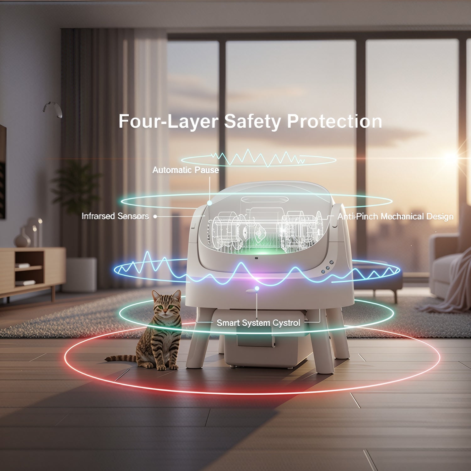 Keep your furry friend safe with our four-layer protection! Automatic pauses, anti-pinch design, and infrared sensors ensure peace of mind. Let your cat explore freely while you relax—smart safety at its best!