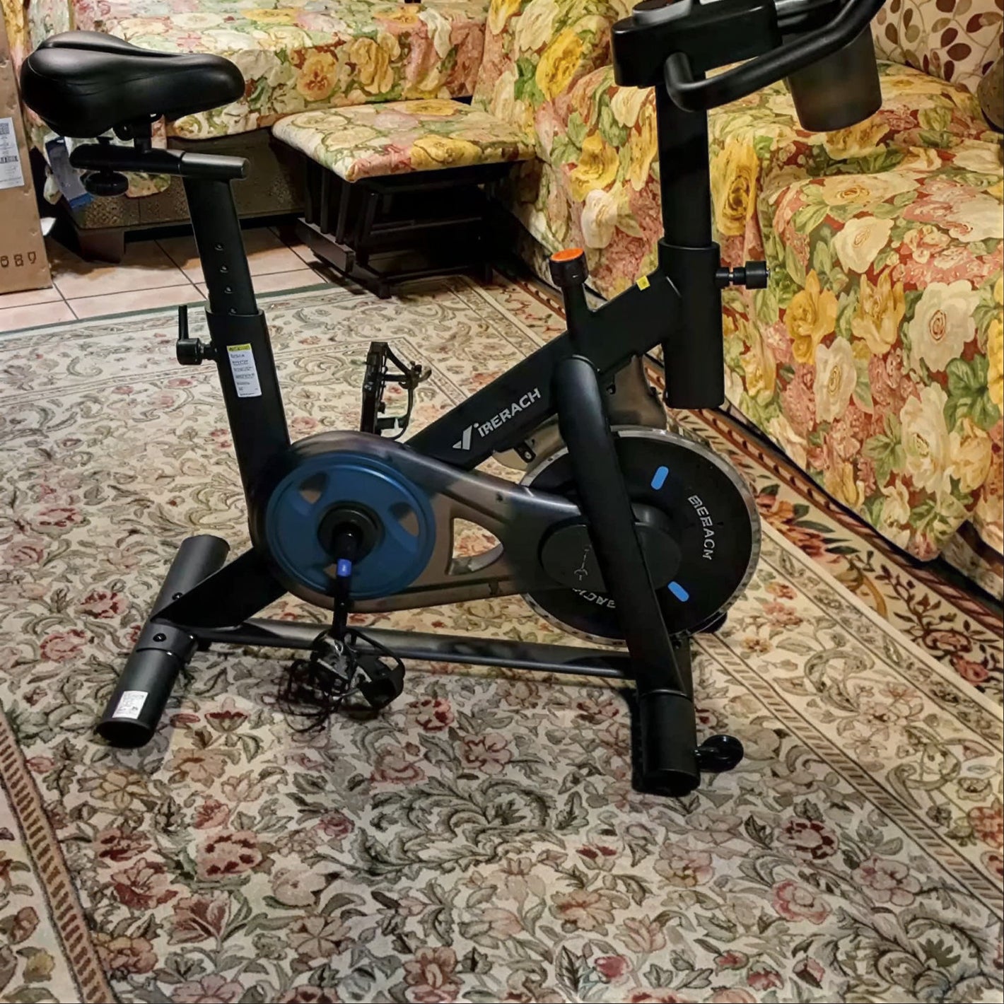 The bike supports up to 300 lbs (136 kg) safely, with stable steel frame construction.